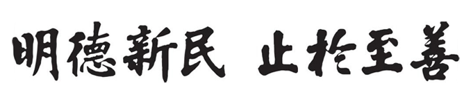 “明德,新民,止于至善”取自《大学》开篇:“大学之道,在明明德,在亲民,在止于至善。”这些话言简意赅地道出办大学的原则在于发扬光明的德性,革新民心,达到完善。“明明德”,意指彰明美德,就是告诫师生通过学习和实践培养优良品德。“亲民”又为“新民”,意为启迪百姓心智,使百姓弃旧图新,去恶从善,这就是将自己的美好道德推己及人,不断求取进步。对于“止于至善”,宋代硕儒朱熹在《大学章句》中解释说:“止者,必至于是而不牵之意;至善,则事理当然之极也。言明明德、新民,皆当止于至善之地而不迁。”也就是说,修身育人,都必须达到完美的境界而毫不动摇。